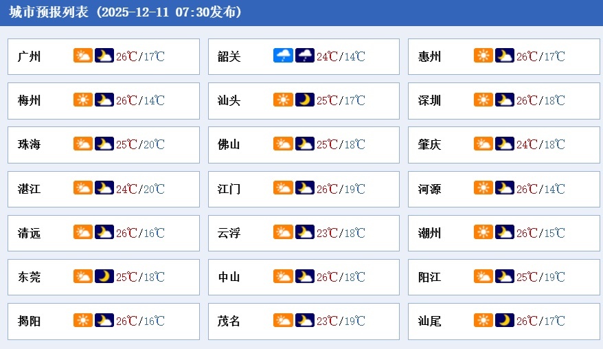 11日,粤西、珠江三角洲西部市县阴天间多云,有分散性零星小雨,韶关和清远市县阴天间多云,夜间转小雨,其余市县多云间阴天;大部市县早晚有轻雾或雾。粤北大部和粤东市县最低气温介于11~14℃,粤西市县18~21℃,其余市县15~18℃。